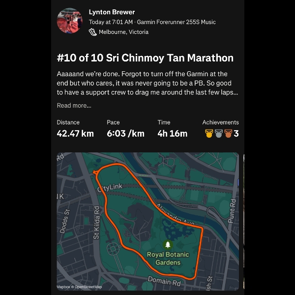 A massive congratulations Lynton. An amazing effort to run all those marathons. Job well done! The Goldies.