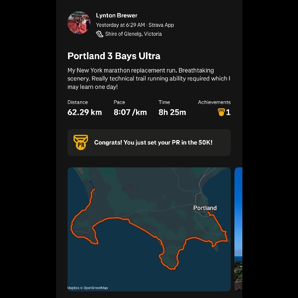 Sunday 2nd Nov After Big Donald declined my request to travel to New York, I was looking for something a bit special to replace it and 3 Bays Ultra did not disappoint. An unbelievably beautiful setting but a very difficult, technical course which had me well outside my comfort zone for the entire experience. Oh and it was 60kms. About 55 people as opposed to 55,000, and most of them finished in front of me. Finished in about 9hrs and 10mins. Share