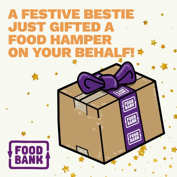 Foodbank sends food where it's needed and a thanks to your friend—stocking a shelf, sparking a smile.